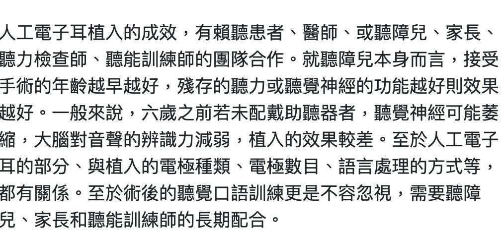 今年英國研究報告中,4000多例接受人工電子耳移植的結果分析,發現兩歲以下接受移植者,約90%可以回到正常教育環境求學,若是2至4歲才接受者,63%可回歸主流教育,若是4至6歲才移植,僅剩下30%。比利時的研究也有同樣的結果。 ---->由此可知植入年齡是關鍵