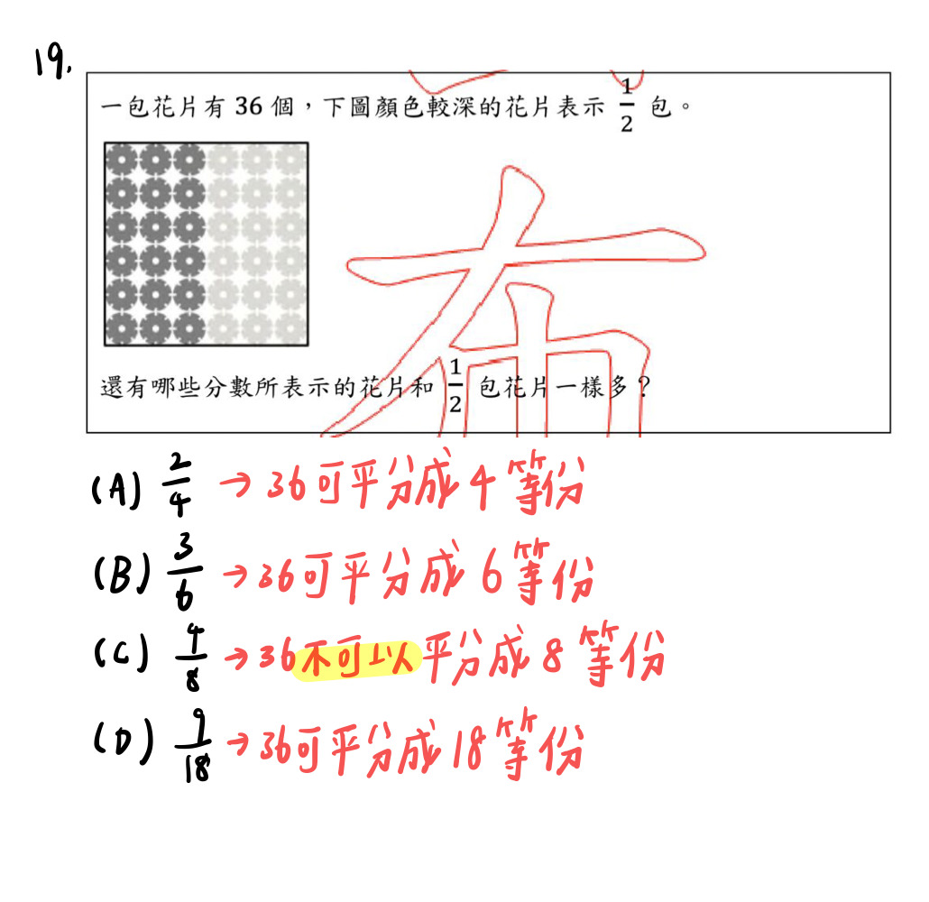 19.針對教學目標「在單位分數內容物為整數個物的情境下,找出給定分數的等值分數」,教師布了一教學活動如下: