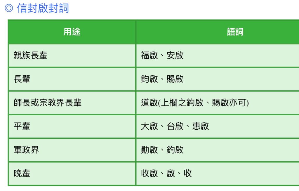 • 「道啟」:專用於師長、教育界人士(「道」指師道、道範),如「某某老師道啟」。