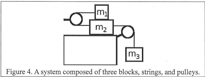 19. As shown in Fig. 4, an m1 = 1.0 kg block is placed on top of an m2 = 8.0 kg block, which lies on a frictionless surface. The coefficient of kinetic friction between the two blocks is 0.20; they are connected via a pulley and a string. A hanging block of mass m3 = 6.0 kg is connected to the mass m2 block via another pulley and string. Both strings are massless and the pulleys are frictionless. What is the acceleration magnitude of the blocks? (Gravitational acceleration g =9.8 m/s²) m1 m2 M3 Figure 4. A system composed of three blocks, strings, and pulleys.