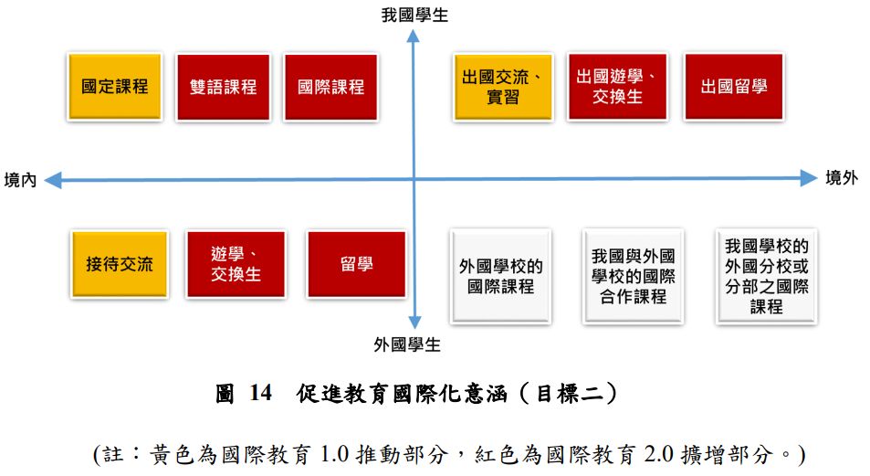 國際教育 1.0 教育國際化活動僅限「國際教育融入國定課程」、「接待交流」及「出國交流及實習」三項,國際教育 2.0 將實施內容大幅擴增。