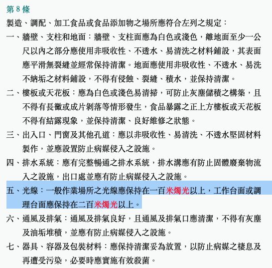 調理檯面:二百米燭光以上;使用之光源,不得改變食品之顏色;照明設備應保持清潔。