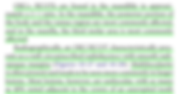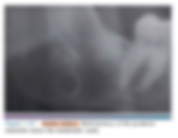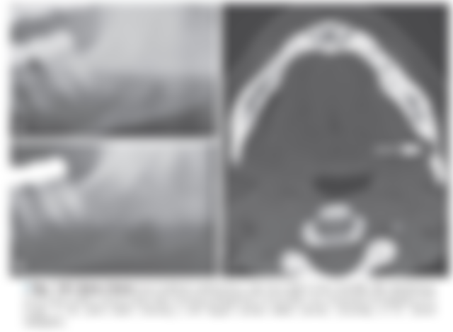 2.一位30歲女性在例行性之X光檢查發現右下顎骨角處有一周界清晰之卵圓形放射線透過性影像,臨床上無任何 症狀,該病灶位於下顎骨下齒槽神經管下方(如下圖所示),您認為下列何者最有可能?