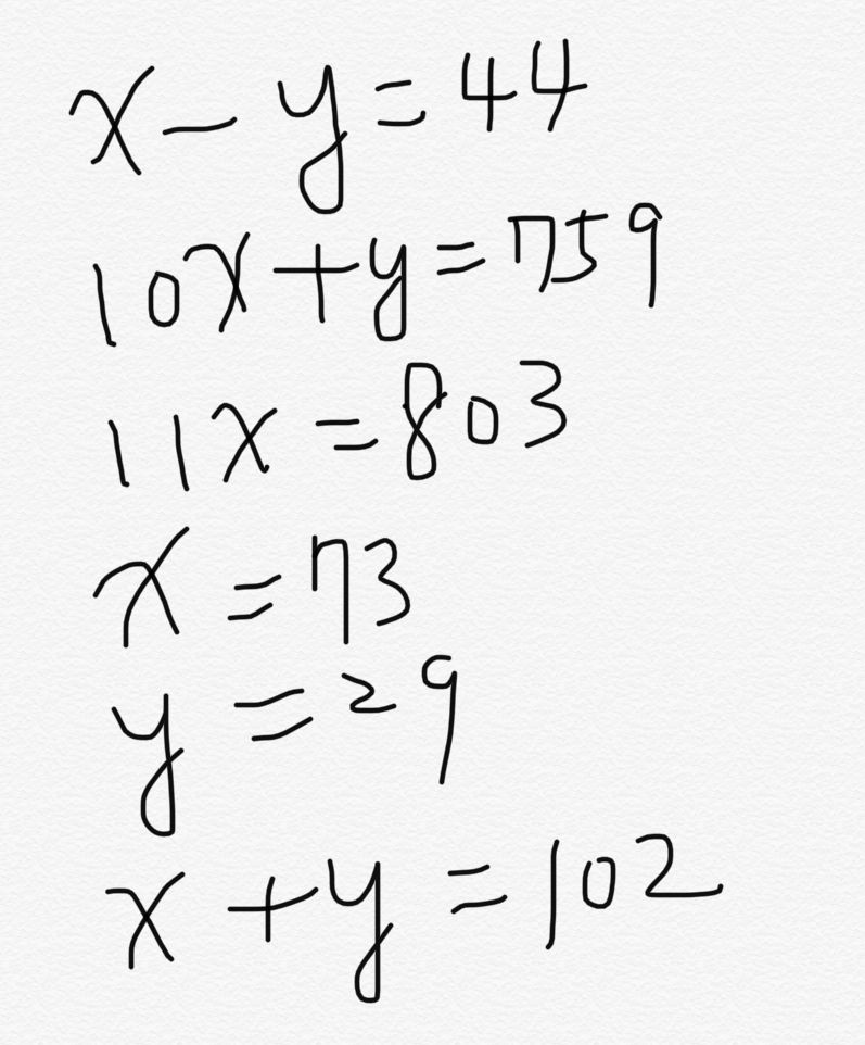 2.四葉和五月在計算一個整數的加法題,粗心的兩人都犯了一些小錯誤。四葉不小心把加號看成了減號,算出答案是 44。五月不小心把被加數的後面多寫了一個 0,算出答案是 759。請問正確的答案應該是多少?
