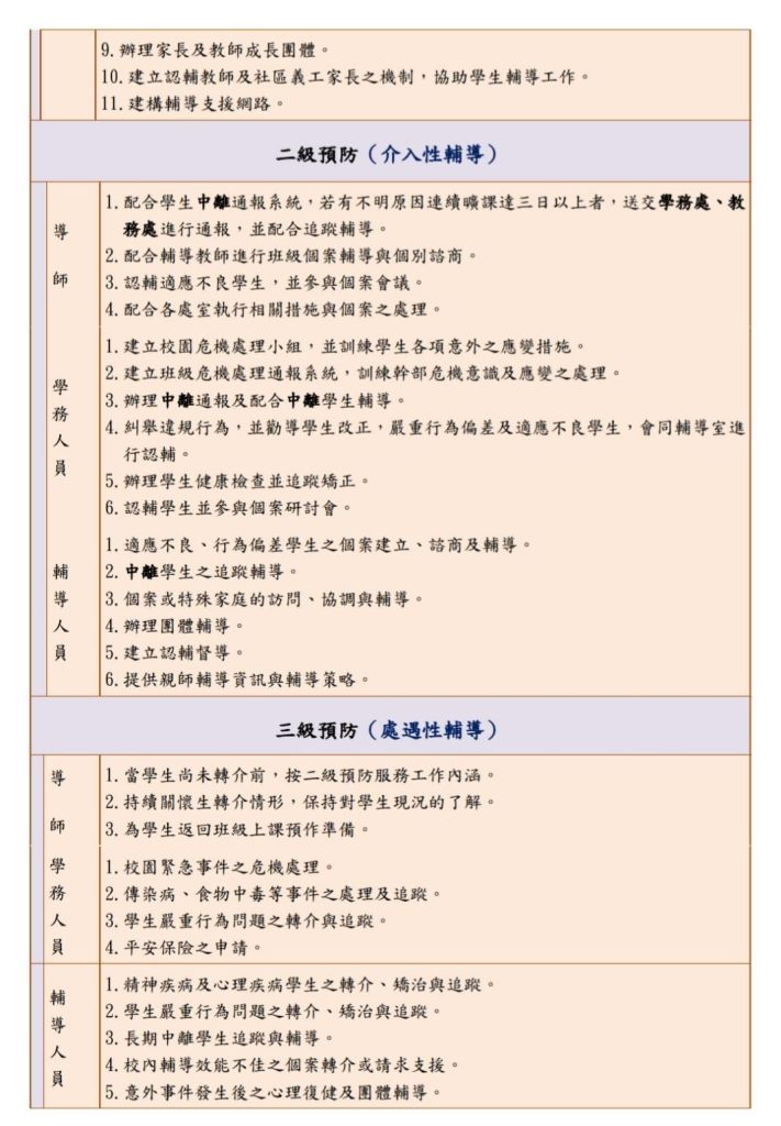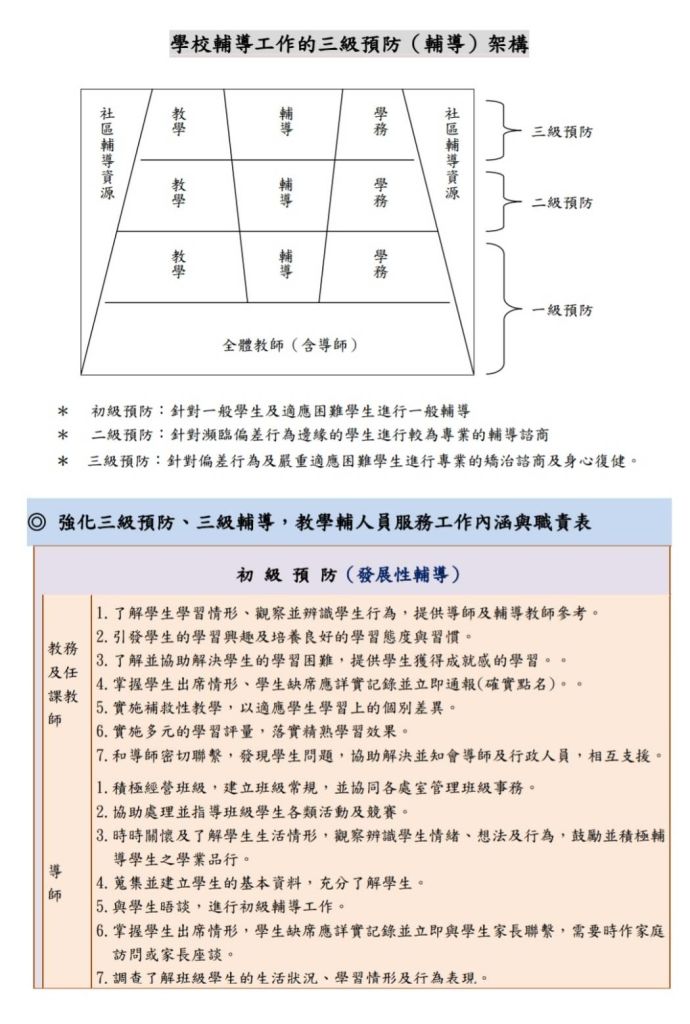 * 三級預防:針對偏差行為及嚴重適應困難學生進行專業的矯治諮商及身心復健。(處遇性輔導)