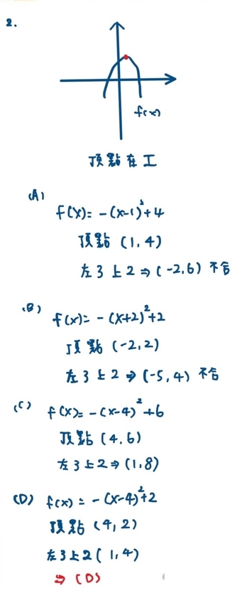 2. 下列哪一個選項中的二次函數經「向左平移3單位長,向上平移2單位長」後,與右圖中的函數圖形重合?
