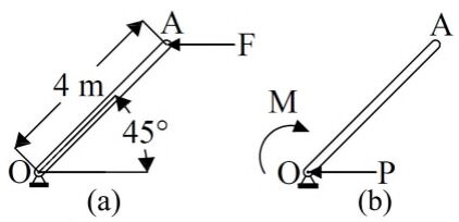 2. 如右圖(a)所示,OA桿長度為4 m且重量不計,A端受F = 25 kN之水平力作用,若將此受力系統改以作用於O點之力與力偶等效系統取代如右圖(b),則下列何者正確?