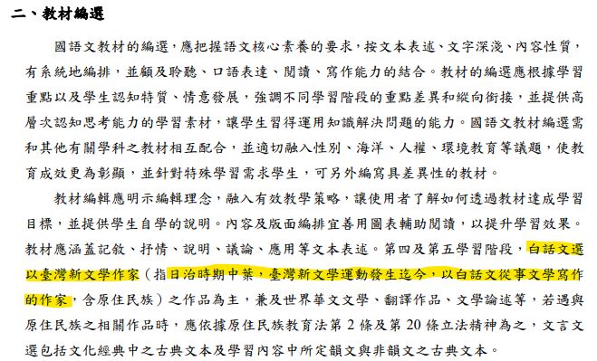 2. 教育部《國語文課程手冊》提及十二年國教國語文課程綱要的研修重點之一:「建議國語文教材應「結合本土素材」。其中,白話文選 以臺灣新文學作家(指__________________ ,以白話文從事文學寫作的作家,含原住民族)之作品為主。」底 線處應填入下列何項?