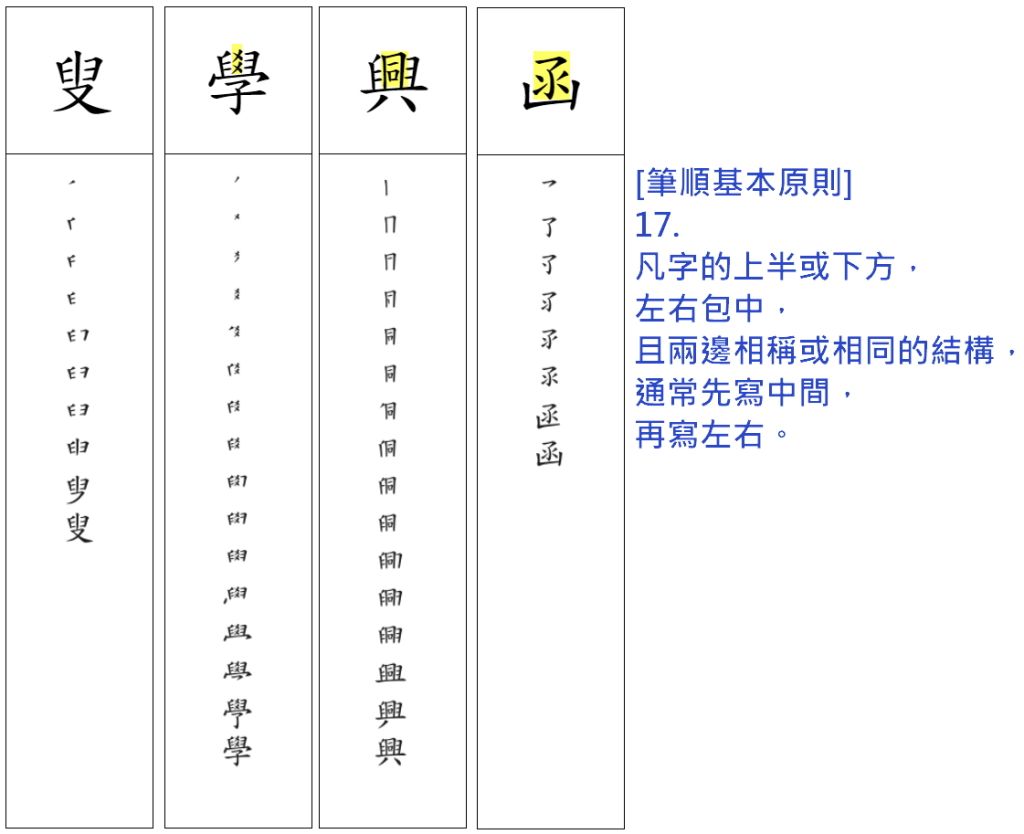 2. 筆順對於國字的學習有其重要性,筆順先後影響筆畫的起落,也可了解字 的結構。筆順書寫有其原則,下列哪一個字的書寫不是「先中間後兩邊」 類型?