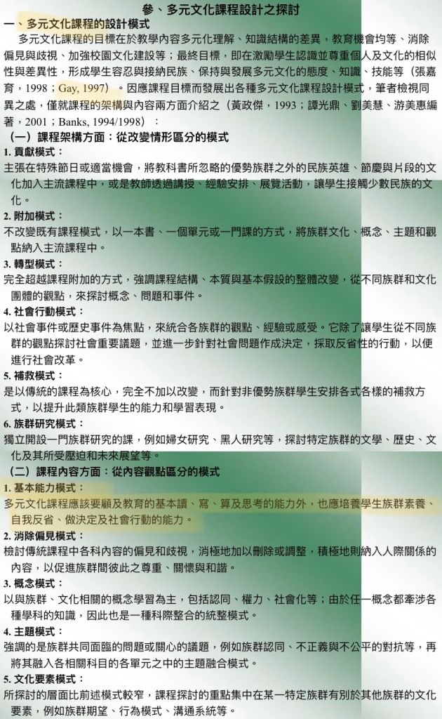 多元文化課程應該要顧及教育的基本讀、寫、算及思考的能力外,也應培養學生族群素養、自我反省、做決定及社會行動的能力。