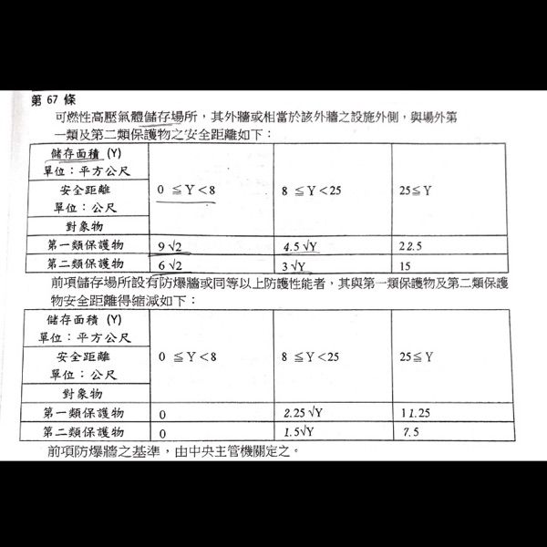 20 依公共危險物品及可燃性高壓氣體製造儲存處理場所設置標準暨安全管理辦法規定,有關設有防 爆牆之液化石油氣容器儲存室,其儲存面積為 9 平方公尺,與場外設置之第 2 類保護物之安全距 離為幾公尺?