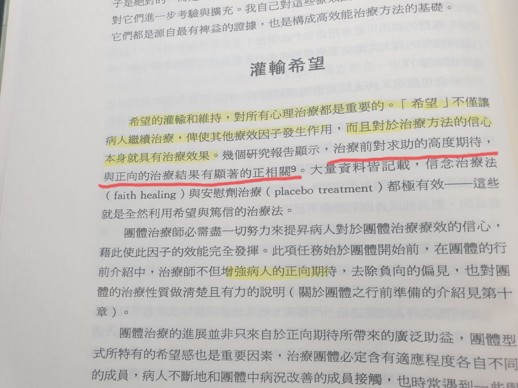 Yalom認為不論是團體或個別治療,案主越認為治療有效,治療就將越有效。在團體可以獲得越多益處的人,就是前測時重視且希望達到個人改變的人,對團體有高度期望,預期團體可以提供自己很多學習機會的人。(團體心理治療的理論與實務,p242