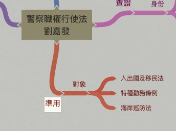 例如:警察法、警察職權行使法、警械使用條例、警察人員人事條例 (警察人員人事條例 第 3 條,所稱警察人員,指依本條例任官授階執行警察任務之人員)。