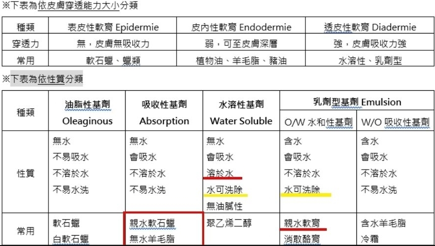 無水吸收性基劑:第一個勾(吸水),親水軟石蠟、無水羊毛脂、Aquabase, Aquaphor (記法:五個字的石蠟、無水的+Aqua)