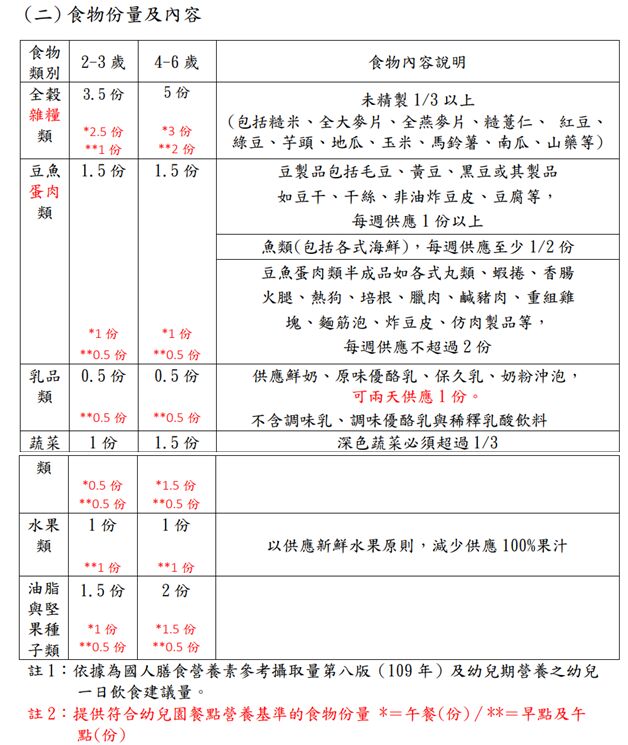 幼兒園均衡飲食應包含六大類食物:全穀雜糧類、豆魚蛋肉類、乳品類、蔬菜類、水果類、和油脂與堅果種子類。 這些類別提供的營養素能支持幼兒的生長發育,維持身體機能正常運作。