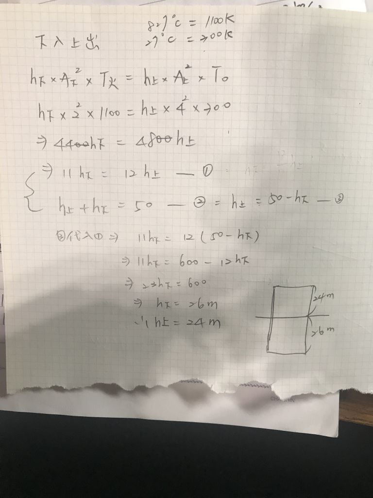 20.建築物高度50m,如建築物內部溫度為827°C,外界溫度為27°C,上方開口為4m2,下方開口為2m2,不計其他條件下,試求建築物之中性帶高度約在多少m?