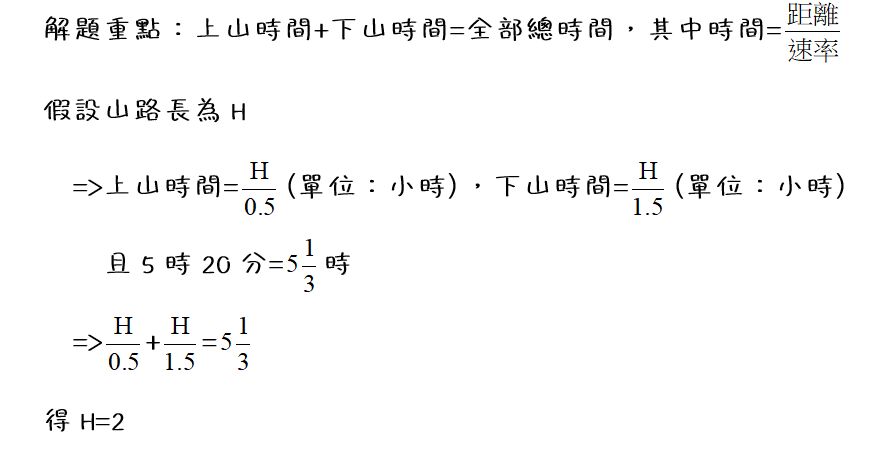 20.某人上山速度每小時 0.5 公里,下山速度每小時 1.5 公里,而 上、下山共花了 5 小時 20 分,請問此段道路全長多少公里?