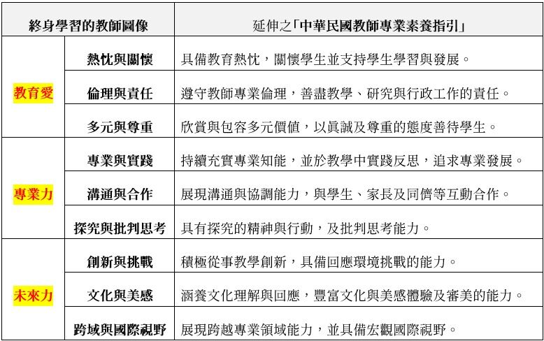 20. 教育部依據「終身學習的教師圖像」延伸訂定「中華民國教師專業素養指引」,以九項