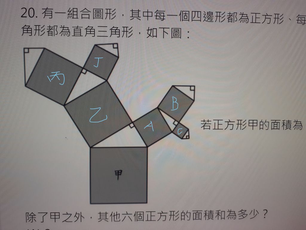 20. 有一組合圖形,其中每一個四邊形都為正方形、每一個三角形都為直角三角形,如下圖: