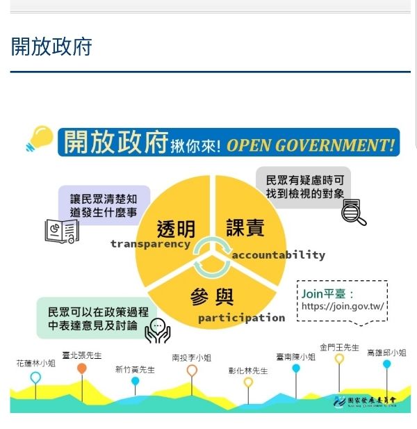 開放政府強調透明、課責及參與,即讓民眾清楚知道發生什麼事、民眾有疑慮時可以找到主責的政府機關,以及民眾可以在政策過程中表達意見與討論。本會目前推動的政府資料開放與公共政策參與平臺,即是秉持開放政府的治理信念,以促進民間與政府的互動,提升民眾對政府的信任。