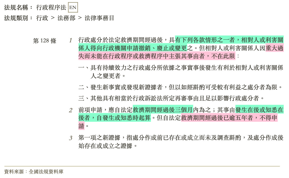 21 依行政程序法第128條之規定,於法定救濟期間經過後,相對人申請撤銷、廢止或變更行政處分之敘述,