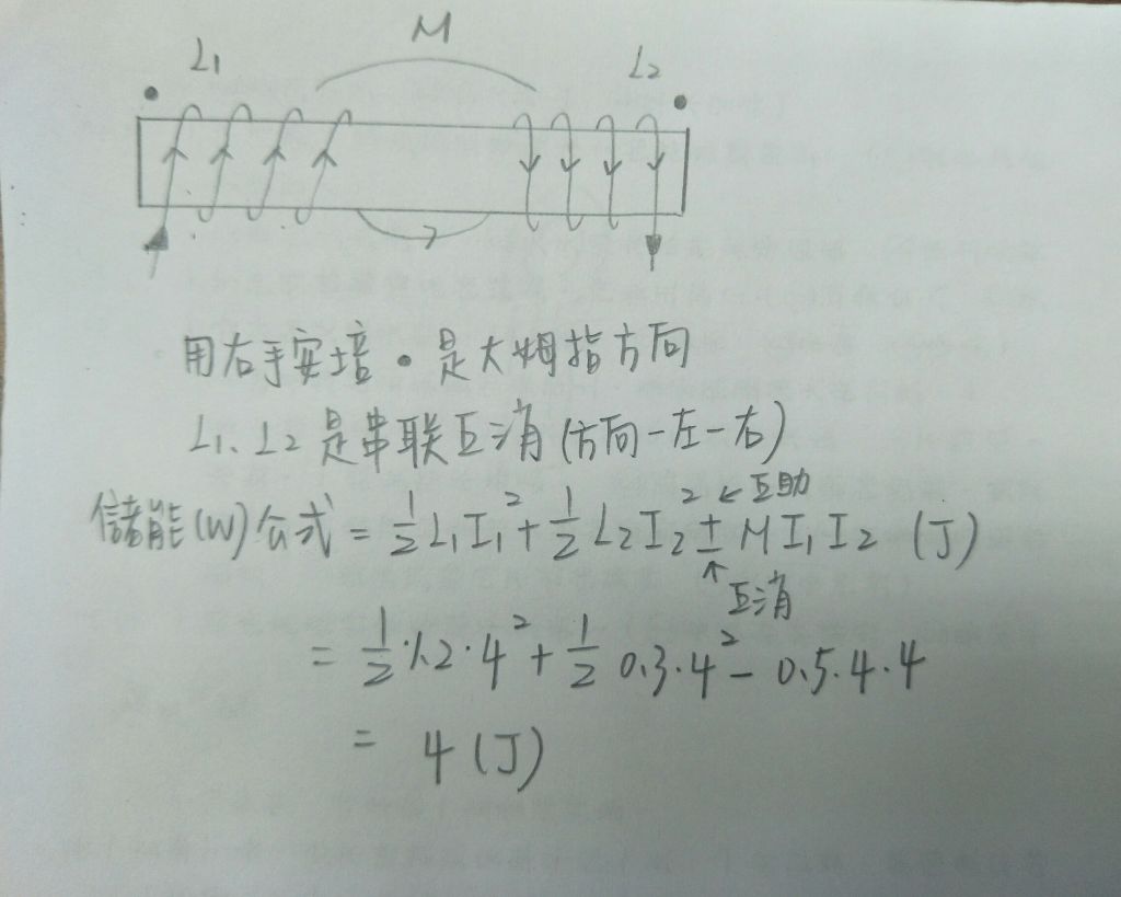 21 如圖兩線圈的電感量分別為 L1=1.2H、L2=0.3H,通過電流I=4安培<A>,若互感量大小為 M = 0.5 H,則兩線圈之總儲能為多少焦耳(J)?