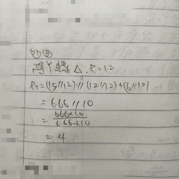 中間Y化三角後與原三角的電阻並聯可得20/3、4、6歐姆,4跟6歐姆串聯後並聯20/3歐姆可得4歐姆