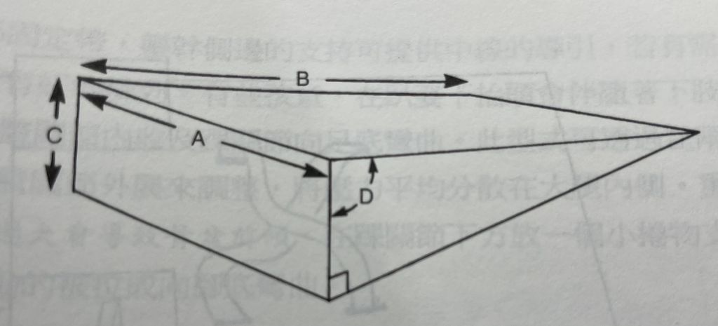 2.長度B:前緣接觸個案胸部的位置決定肩部的穩定,越短越吃力,且需依腰椎與骨盆傾斜之角度決定末端需延伸至軀幹或腿部
