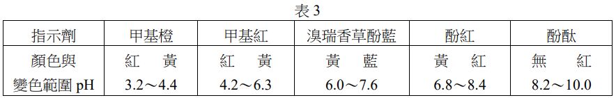 21.化學實驗室中有五種酸鹼指示劑,其變色範圍pH列於表3中。現有甲、乙、丙、丁、戊等五種溶液,小雨想要比較此五種溶液的酸鹼度,於是她在此五種溶液中分別滴入不同的指示劑,所觀察到的顏色如表4所示。下列有關溶液中氫離子濃度的比較,何者正確?