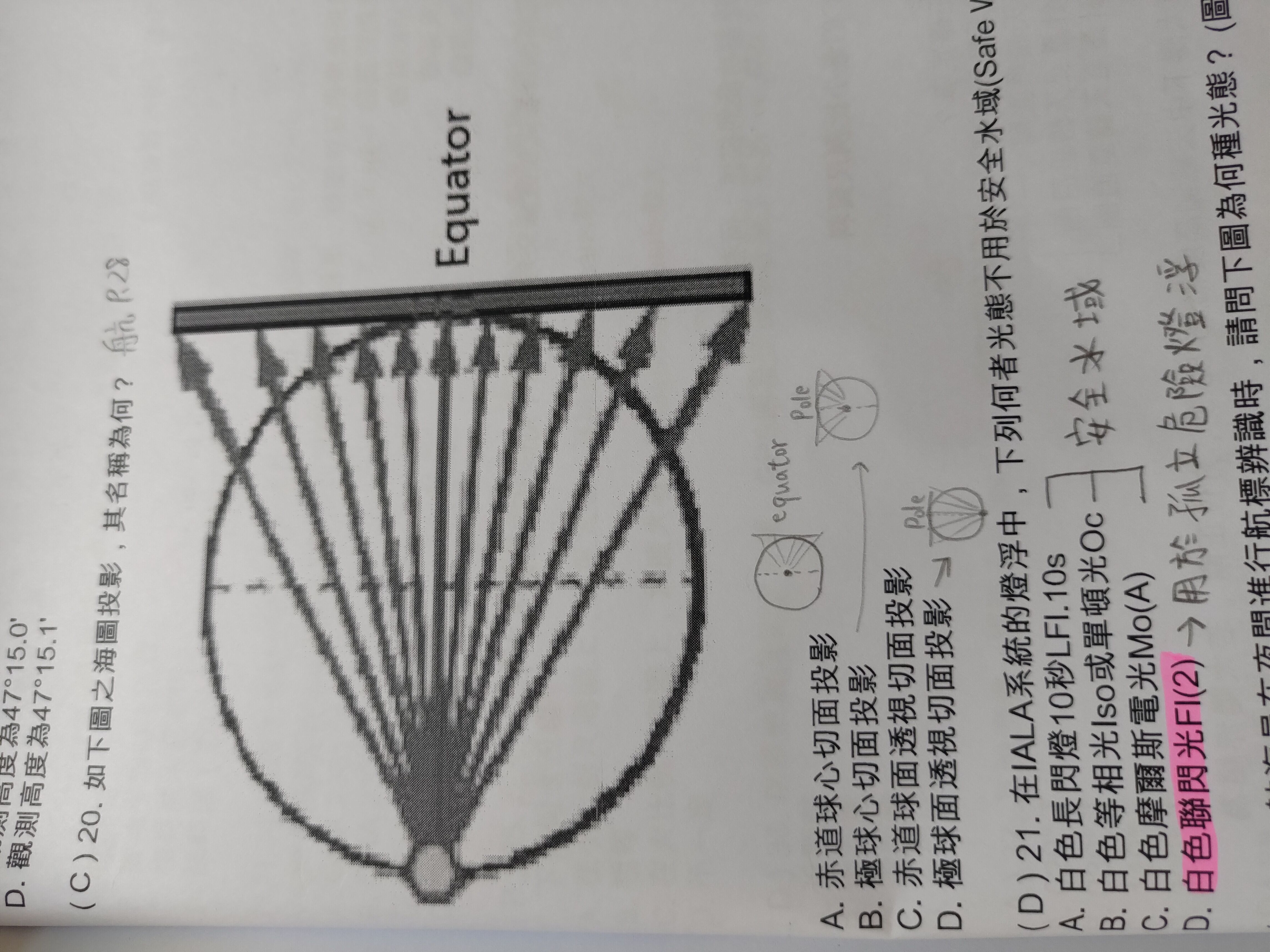 21. 在IALA系統的燈浮中,下列何者光態不用於安全水域(Safe Water)燈浮?