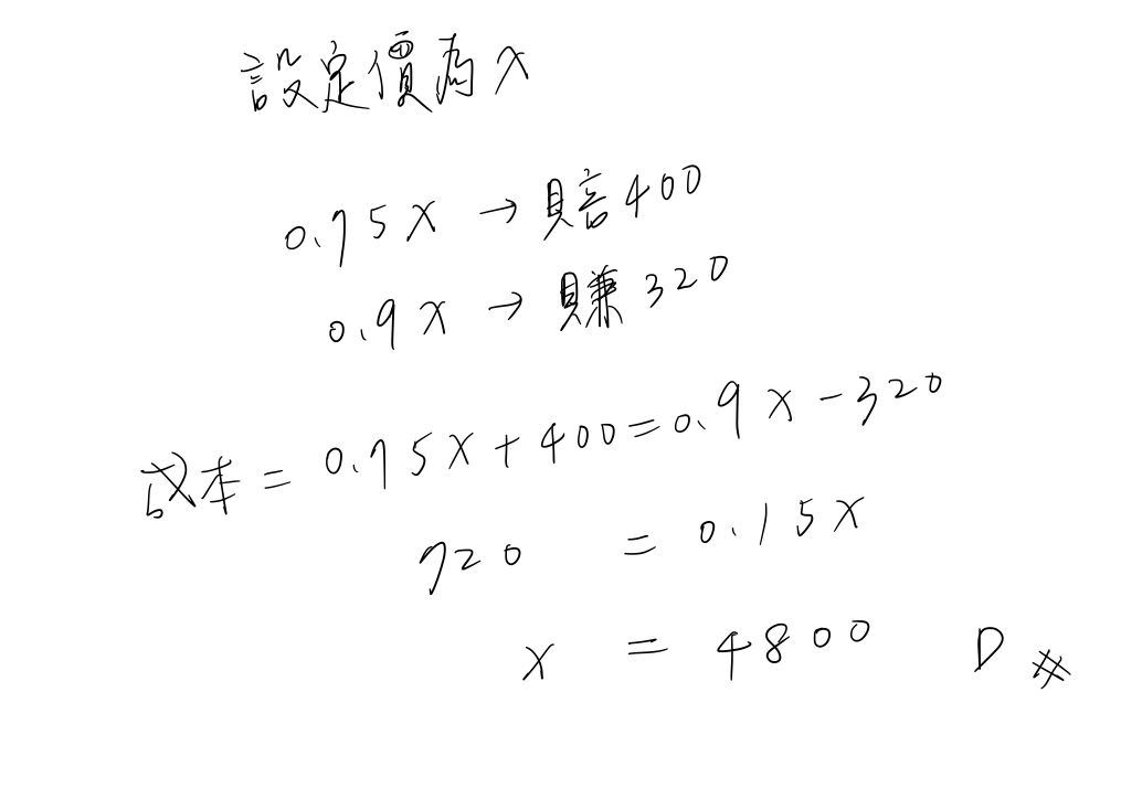 400 元,老闆希望照定價九折賣給小英,這樣他剛好賺 320 元,如果老闆說的是實