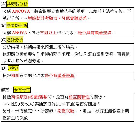 | 共變數分析 | 是一種統計控制的方法 目的在增進統計考驗力和降低實驗誤差 |