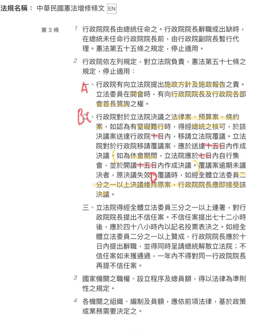 三、立法院得經全體立法委員三分之一以上連署,對行政院院長提出不信任案。不信任案提出七十二小時後,應於四十八小時內以記名投票表決之。如經全體立法委員二分之一以上贊成,行政院院長應於十日內提出辭職,並得同時呈請總統解散立法院;不信任案如未獲通過,一年內不得對同一行政院院長再提不信任案。