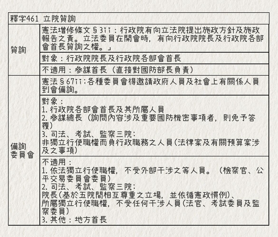 A我真的看不出來對在哪,備詢明明是在委員會,答案卻是在院會就很有問題了,再來參謀總長可以不備詢的原因明明是涉及國防機密才免予答覆,非行政院部會首長根本不是免備詢的原因,頂多是參謀首長免質詢的原因吧,A到底哪裡正確了?