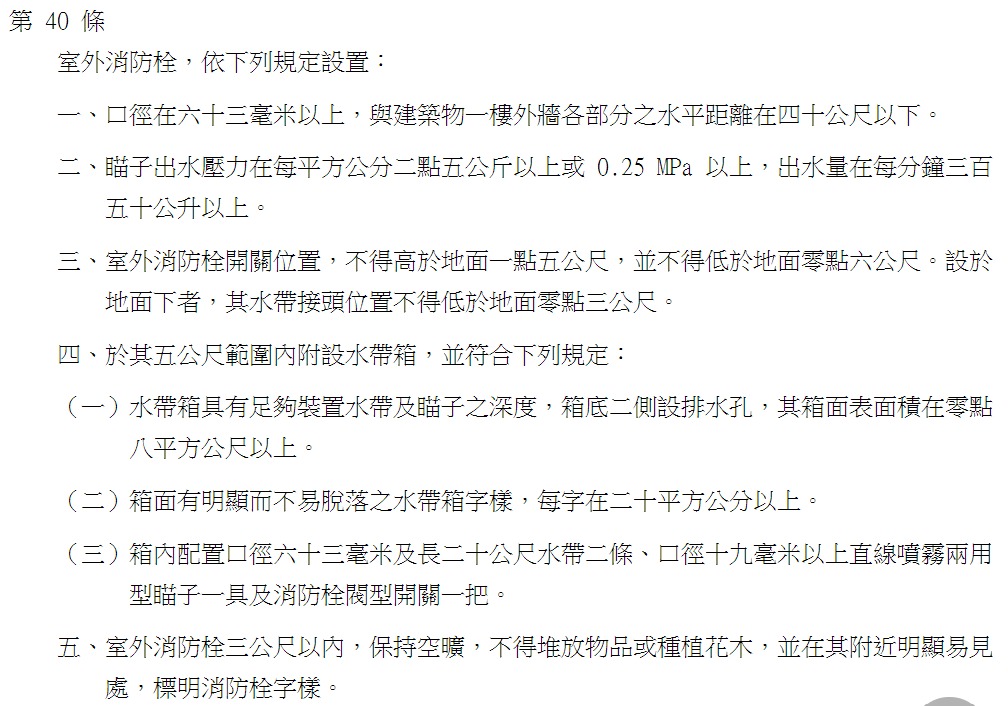 一、口徑在六十三毫米以上,與建築物一樓外牆各部分之水平距離在四十公尺以下。