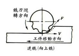 逆銑法-銑刀之迴轉方向與工件進給方向相反