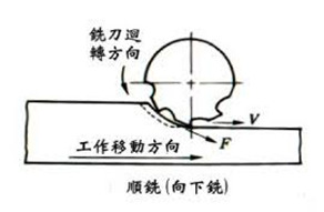 順銑法-銑刀之迴轉方向與工件進給方向相同