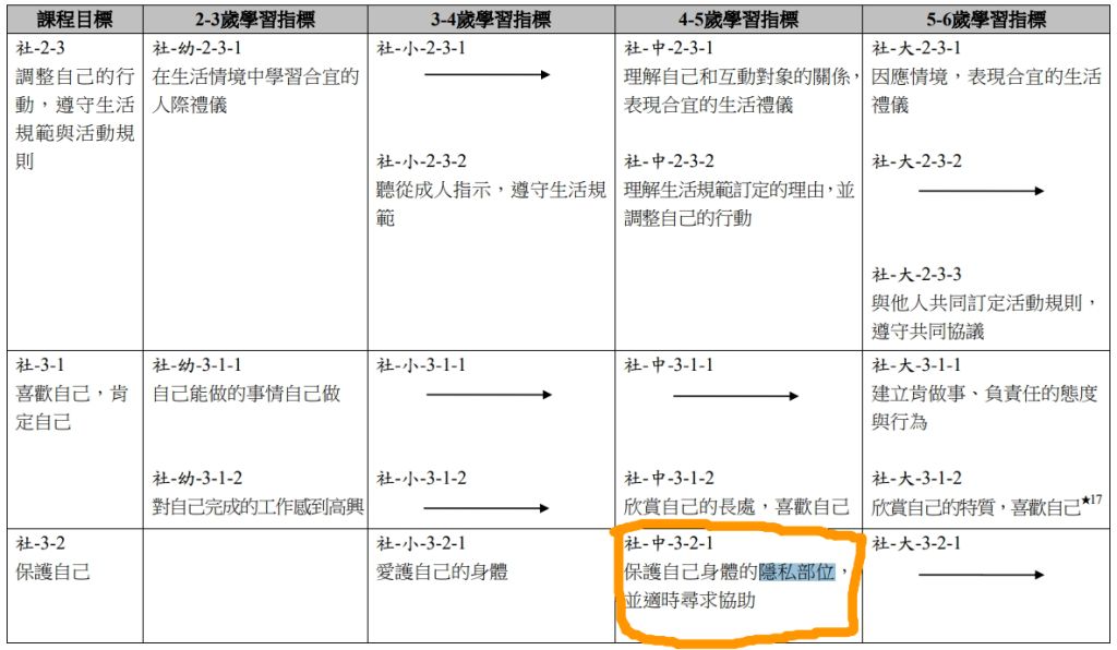 | 社-小-3-2-1 愛護自己的身體 | 社-中-3-2-1 保護自己身體的隱私部位,並適時尋求協助 | 社-大-3-2-1保護自己身體的隱私部位,並適時尋求協助 |