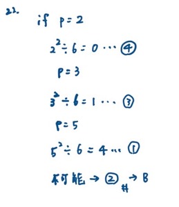 22. 若P是一個質數,則 P2÷ 6 所得的餘數不可能是哪一個數?