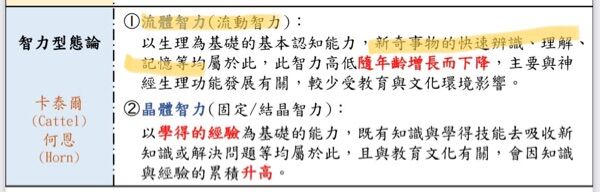 「流體智力」與「晶體智力」的概念來自於美國心理學家卡爾泰( R. B. Cattel )的理論,是採用「不固定答案式的智力測驗」所測得的智力層次,受試者必須隨機應變考試題目,運用思考去解決問題。