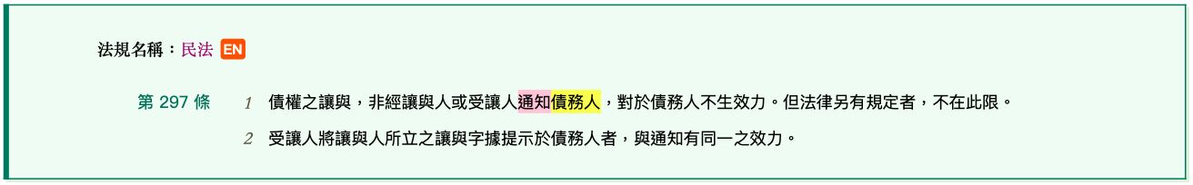 債權之讓與,非經讓與人或受讓人通知債務人,對於債務人不生效力。但法律另有規定者,不在此限。