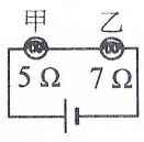 23 下圖中的電路,係由一個電池與兩個燈泡組成,其中甲燈泡的電阻是5歐姆,乙燈泡的電阻是7歐姆,則下列敘述何者正確?