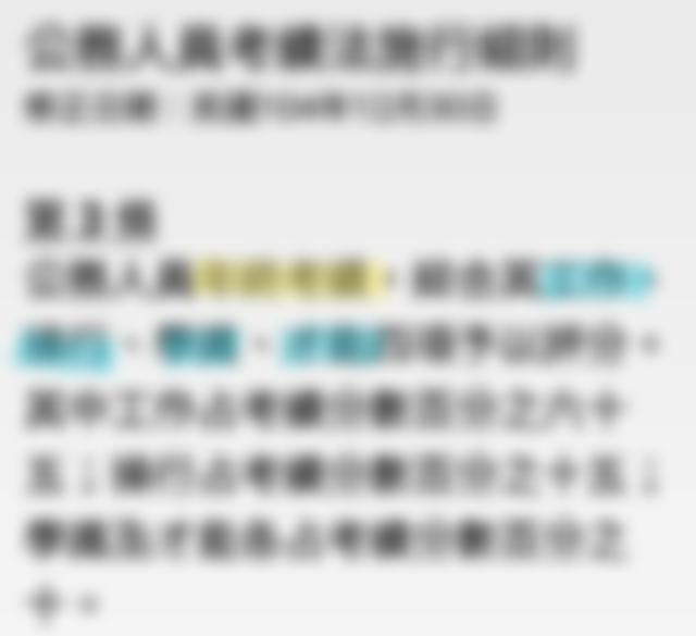公務人員年終考績,綜合其工作(65%)、操行(15%)、學識(10%)、才能(10%)四項予以評分。其中工作占考績分數百分之六十五;操行占考績分數百分之十五;學識及才能各占考績分數百分之十。