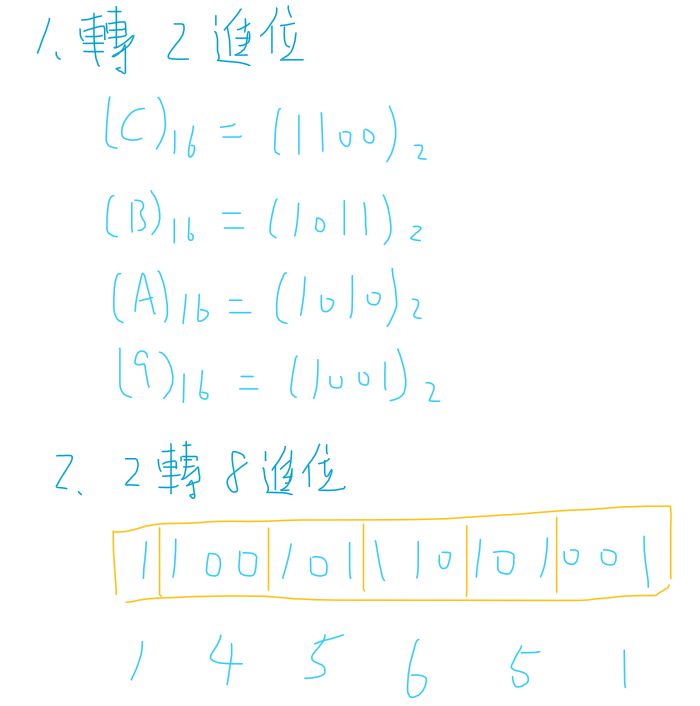 23 將一個十六進位無號數的數值 CBA9 轉換為無號數的八進位數值,轉換後的八進位數值為下列何者?