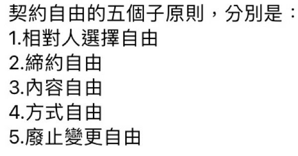 3. 決定契約內容的自由:契約當事人對契約內容可以自由訂立,但契約內容不得違反法律強行規定、禁止規定、公序良俗。