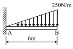 (A) 分佈力對 A 點產生之力矩為 3kN-m (B) A 端垂直反力為 750N (C)彎矩圖為二次方拋物線 (D) 危險斷面在固定端