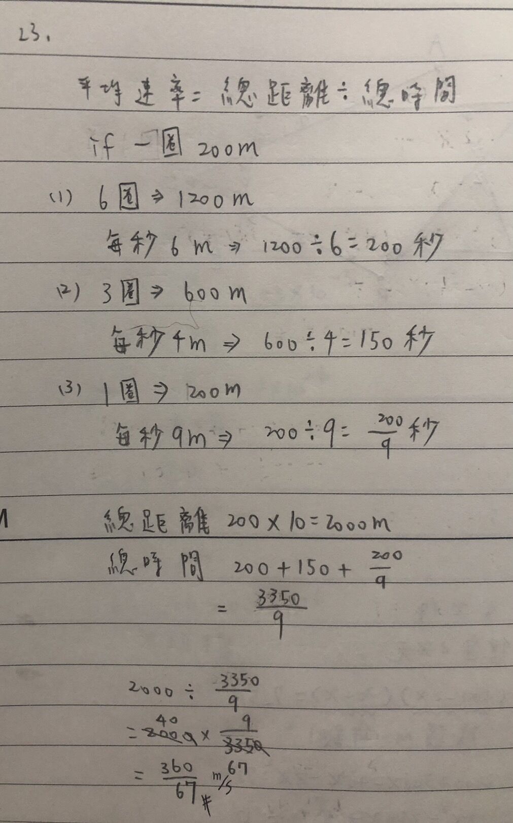 23. 小明參加跑步比賽,一共要跑 10 圈操場,前 6 圈,小明皆以每秒 6 公尺的速率前進,接著小明有點疲累速度慢了下來,以每秒 4 公尺的速率跑了 3 圈,最後一圈,小明以每秒 9 公尺的速率 衝向終點,請問小明整場比賽的平均速率是多少?