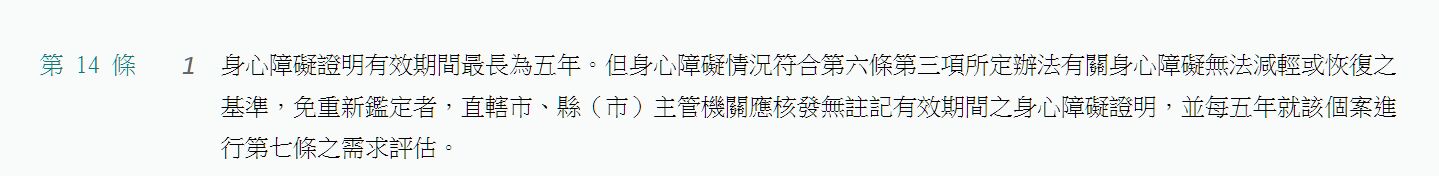 根據我國身心障礙者權益保障法第14條規定,身心障礙證明有效期限最長為五年,身心障礙者應於效期屆滿前九十日內向戶籍所在地之直轄市、縣(市)主管機關申請辦理重新鑑定及需求評估。