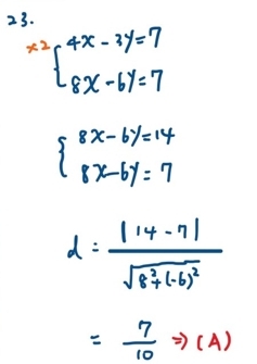 23. 若兩直線4x-3y=7, 8x-6y=7的距離為 d ,則 d =?