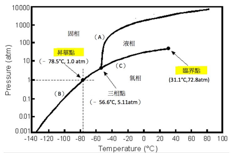 (B)在一大氣壓下,二氧化碳的熔點低於 200 K